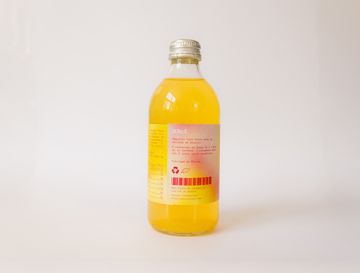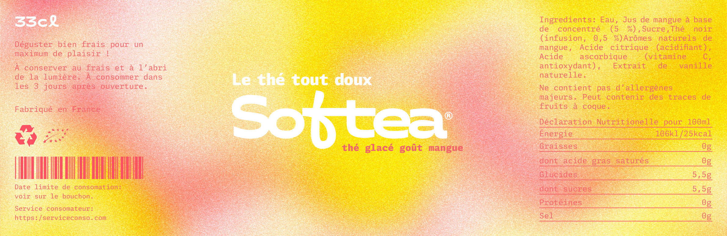 Étiquette conçue pour une marque fictive de thé glacé à la mangue. Réalisée sur InDesign, Illustrator et Photoshop.
